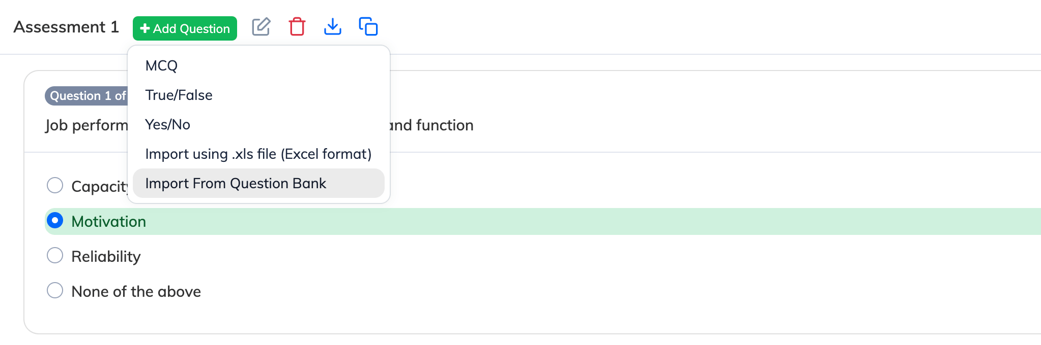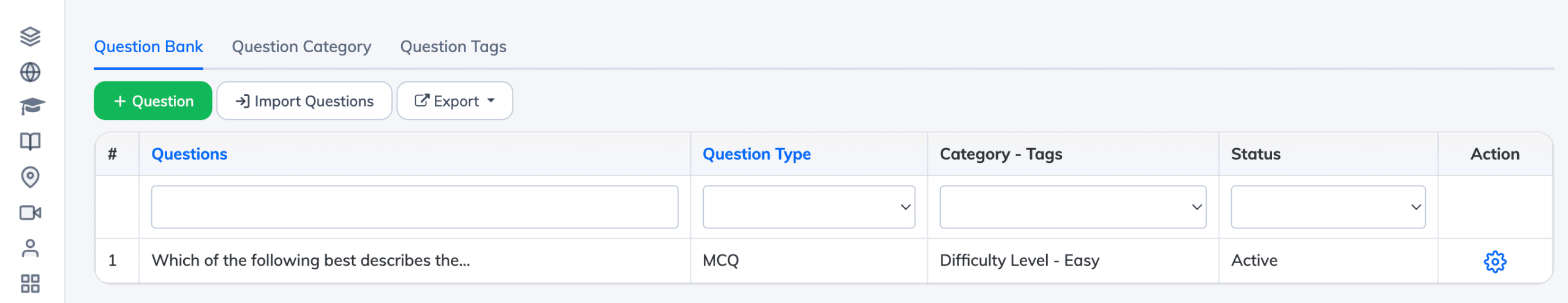 The Question Bank feature in AlphaLearn LMS serves as a centralized repository where Administrators and Managers can create and manage questions for assessments, assignments, and exams. It supports various question types, as well as question categorization and tagging, enabling better organization and retrieval. Questions stored in the bank can be easily imported for use across different evaluations, including assessments, assignments, and exams.