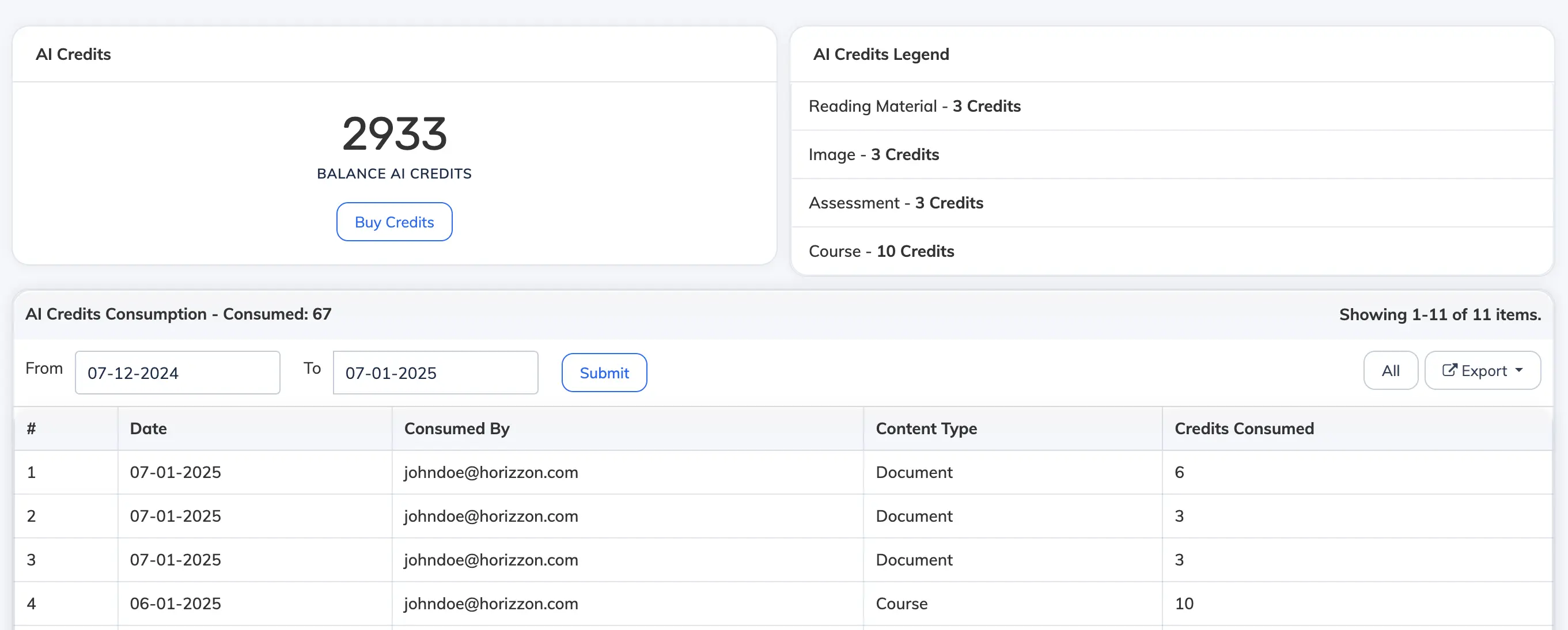 Here is how you can add AI-generated content in AlphaLearn LMS and manage AI Credits: