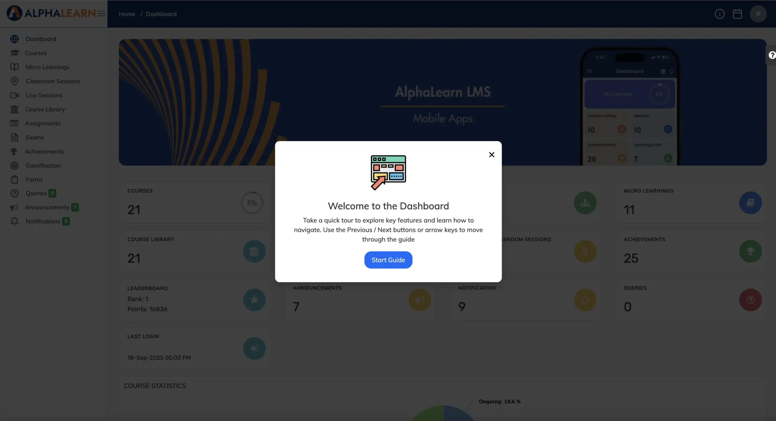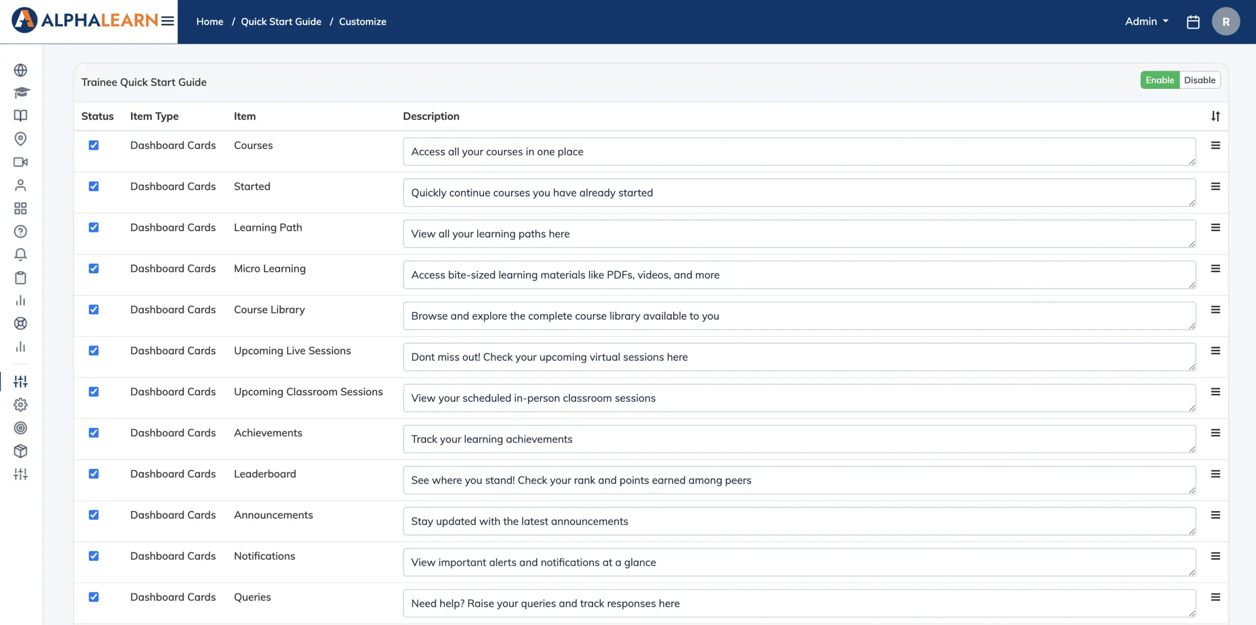 The Quick Start Guide offers Trainees an interactive walkthrough of their dashboard, helping them navigate key features with ease. In each step you can customize the description, allowing you to tailor the experience. Steps can also be reordered to prioritize based on importance.